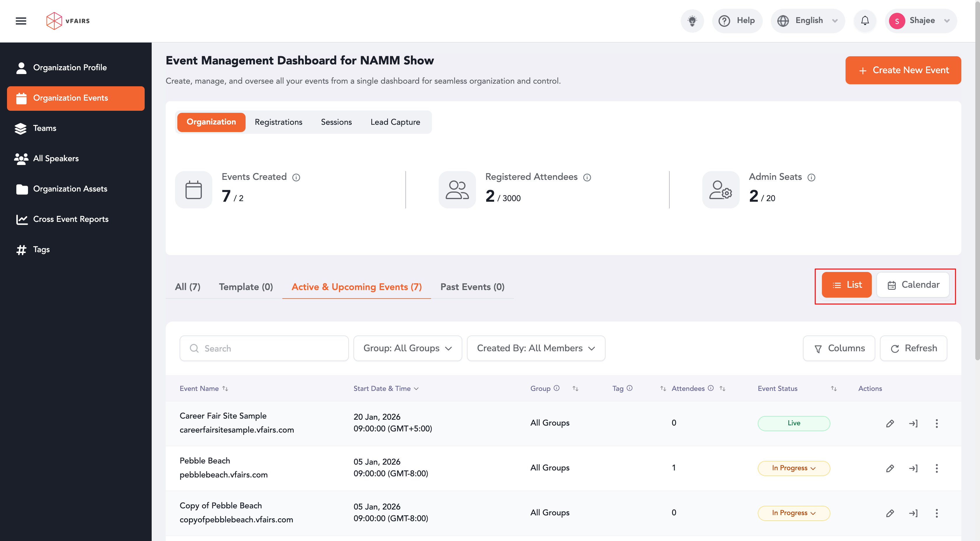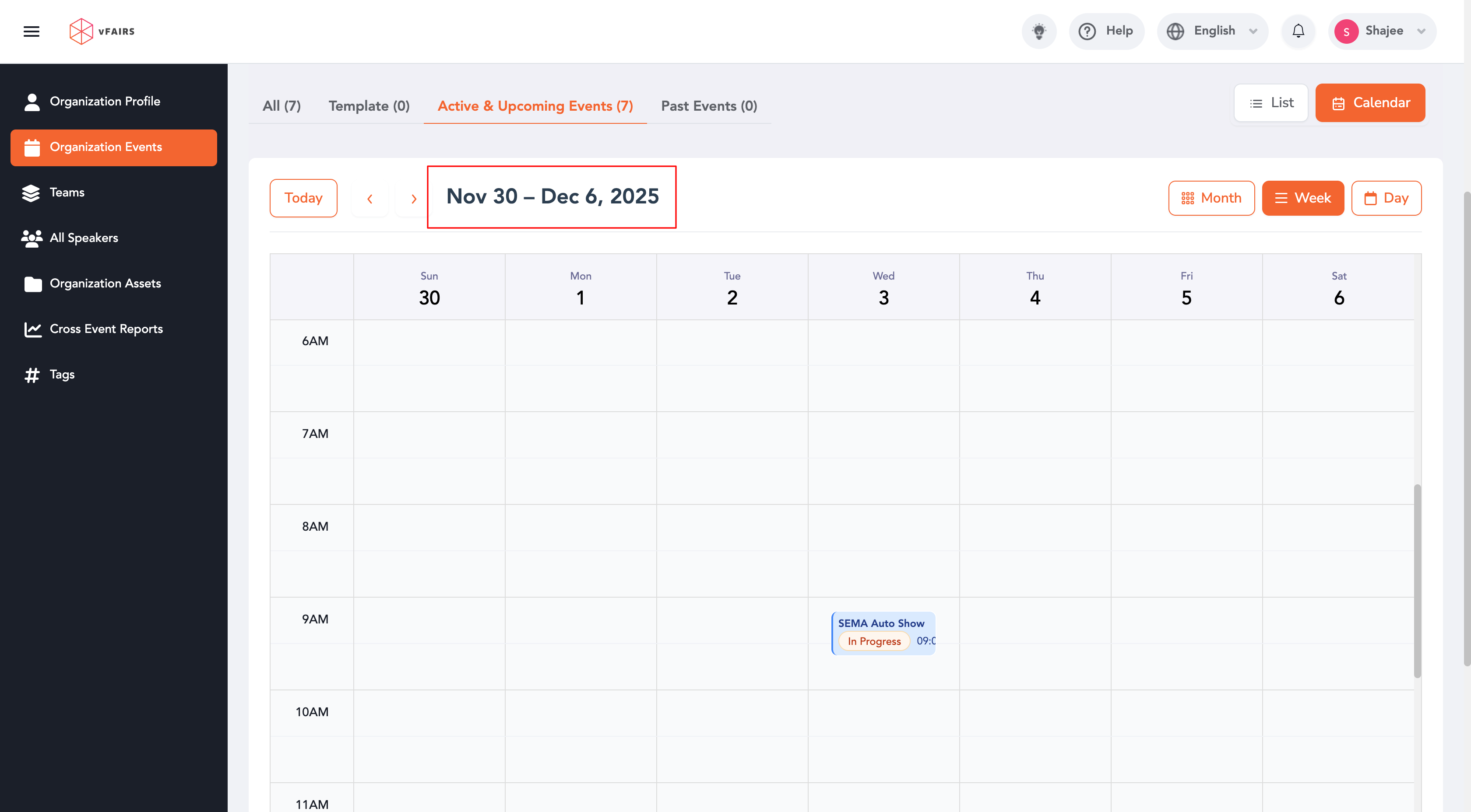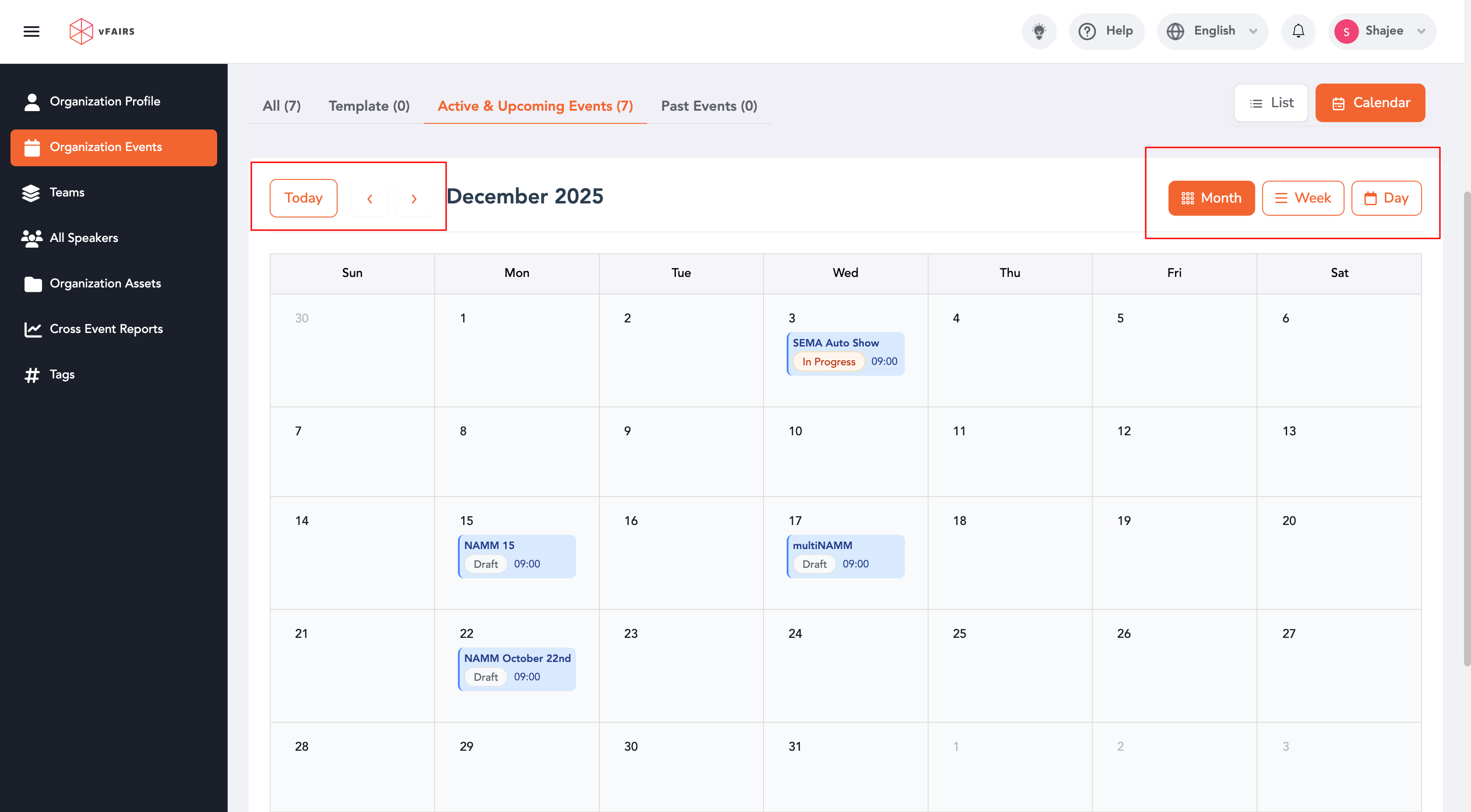 The Calendar View allows organisers to visually browse and manage events by date, switch between time ranges, and quickly access key event actions.