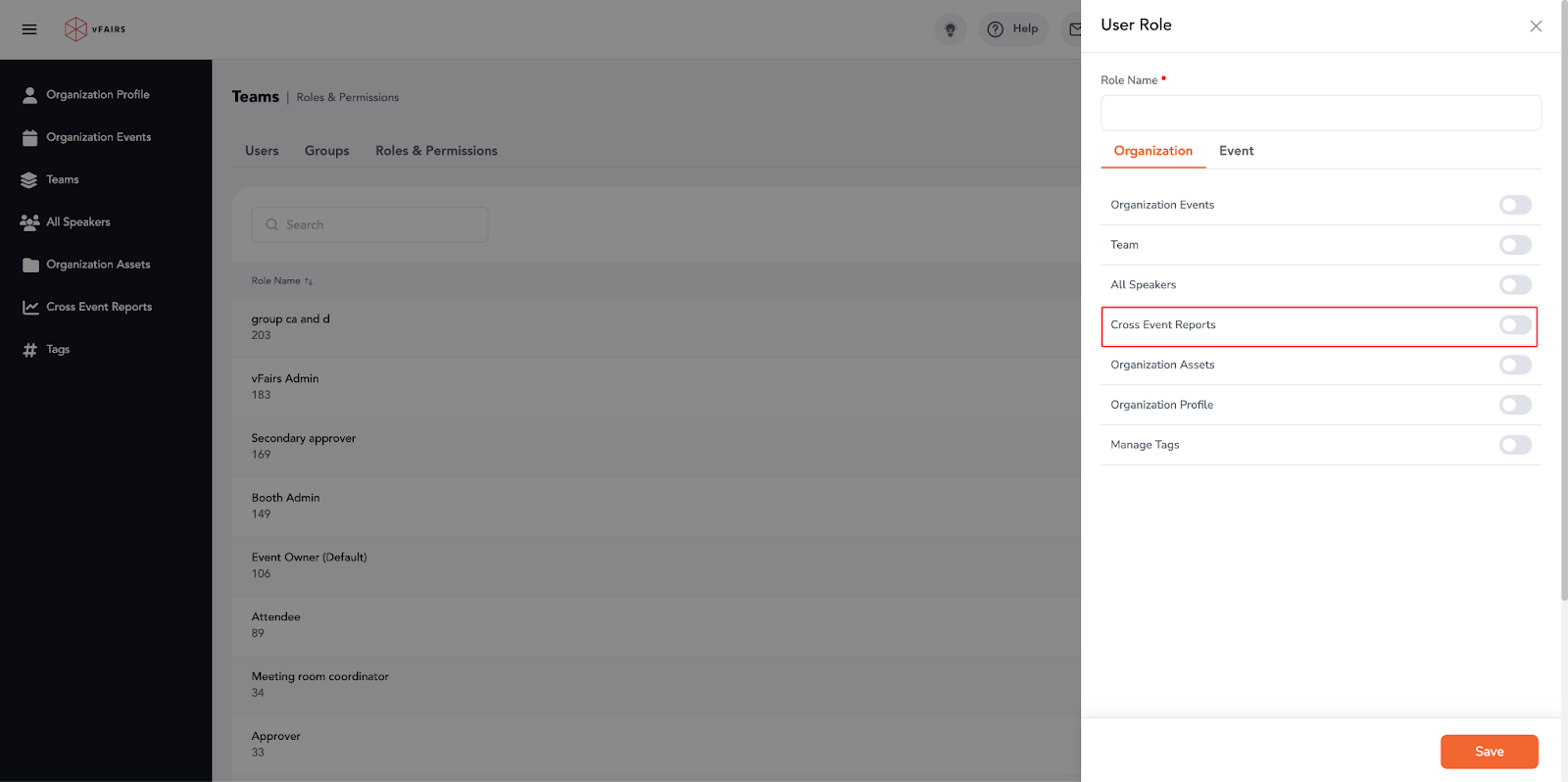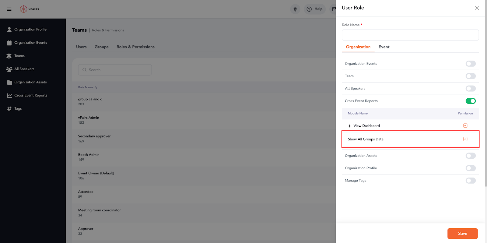 Organisation Settings → Teams → Roles & Permissions → Cross Event Reports → Show All Groups Data