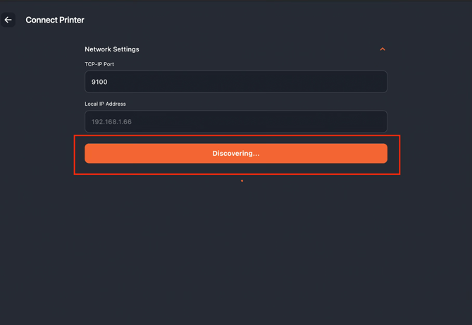 At the bottom, the Discovering… button shows that the app is scanning for available printers.