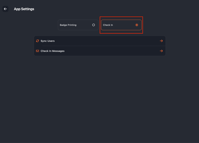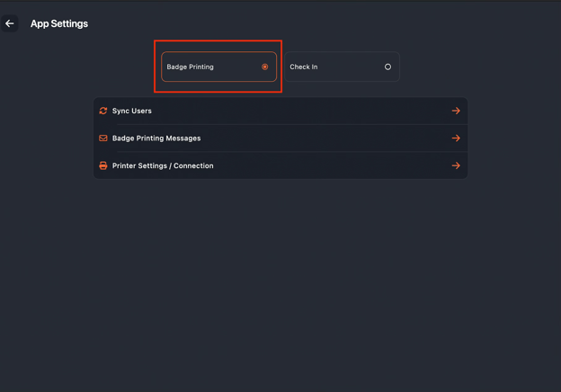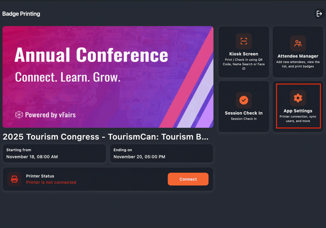 To configure printer settings, sync users, or adjust badge-printing messages, tap the App Settings tile (highlighted on the right).