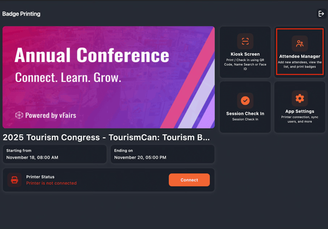 This screen shows the main dashboard once logged into the vFairs Onsite App.To manage attendee records — including viewing, editing, adding new attendees, or printing badges — tap the Attendee Manager tile highlighted on the right.