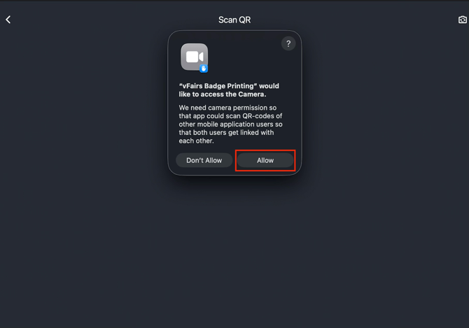 Note: If “Don’t Allow” is selected, the app will not be able to scan badges until permission is granted in device settings.
