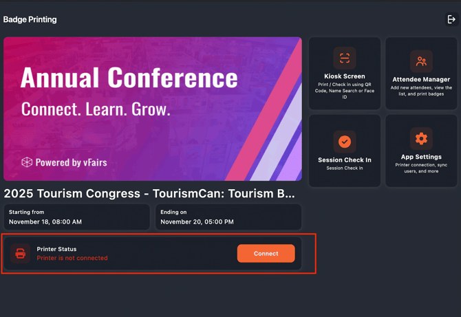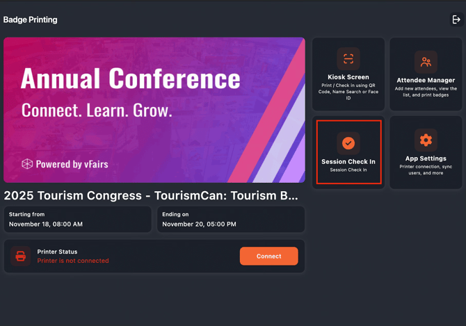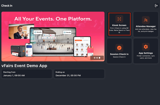 - Navigation tiles such as Kiosk Screen, Attendee Manager, Session Check-In, and App Settings