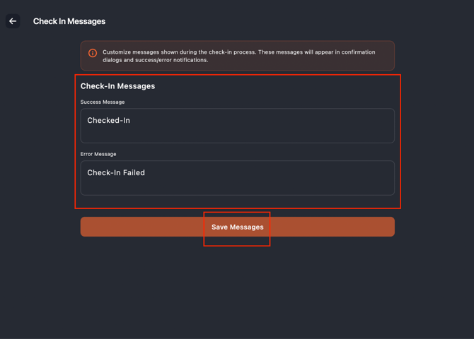 - Check-In Messages — allows configuration of the success and error messages that appear during the check-in workflow.