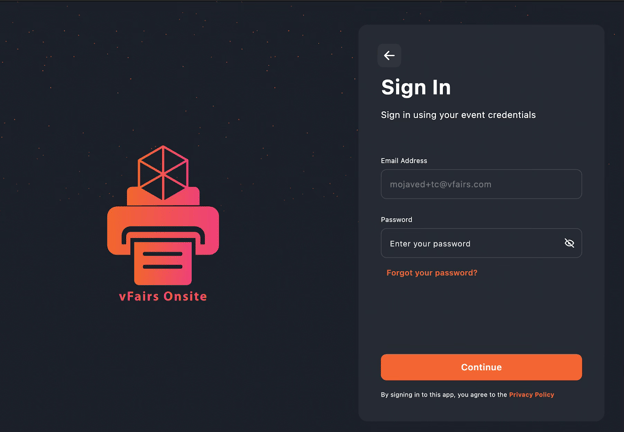 Here, they are prompted to enter the email address provided by the vFairs Project Manager.