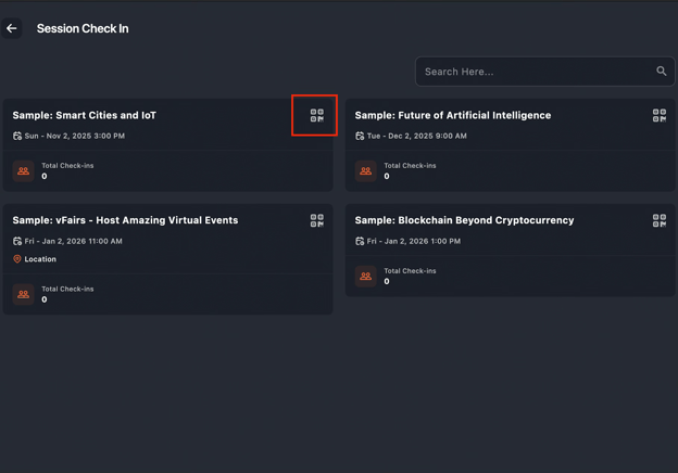 To start scanning attendees for a session, tap the QR icon next to the session you want to manage.