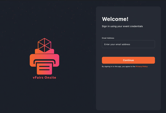 Below is a walkthrough of each screen the user will encounter when accessing and setting up the vFairs Onsite Mobile App.