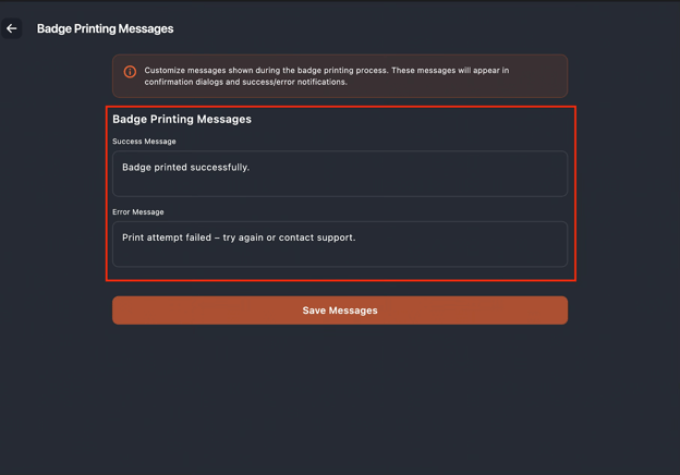 This screen allows you to customize printing feedback messages that appear during badge printing.