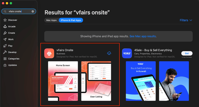 Go to the Apple/Google App Store search results for “vFairs Onsite.”