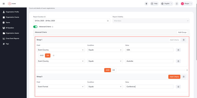Advanced Criteria allows organisers to build complex filtering logic using groups and conditions. This feature supports both AND and OR logic, enabling flexible and precise data queries. When enabled, the system begins with a single group and one default condition. Users can continue adding conditions or creating additional groups to construct the exact logic they need.