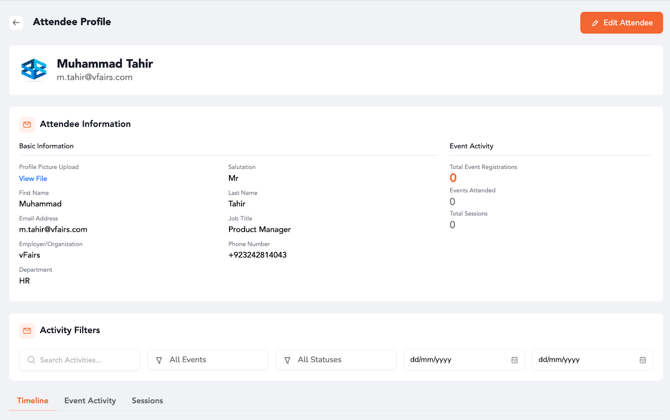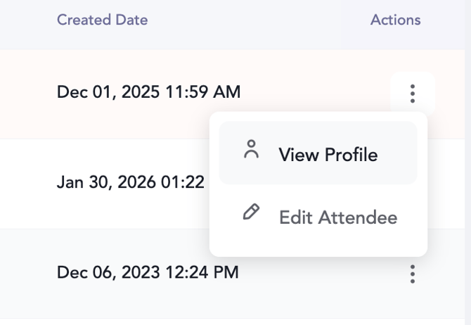 - View Details: Click the three dots (...) on the far right of the attendee’s row and select View. Here, you can see their profile information and a history of the events and sessions they attended.