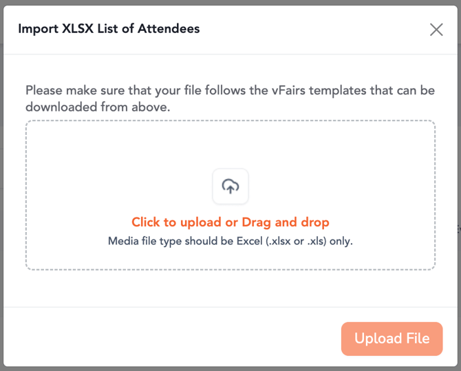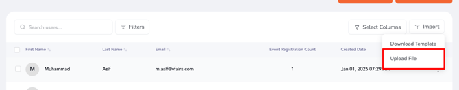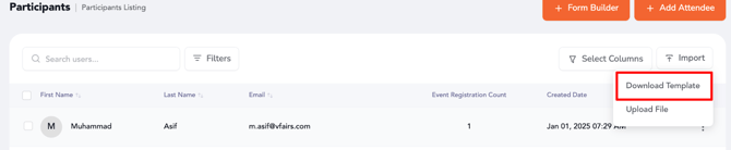 - Import: Download the template, fill it out, and upload attendees in batches with the "Upload Attendees" button.
