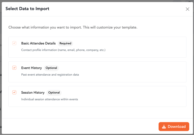 - Bulk Upload (Template): Click on Import -> Download Template. Choose between "Basic Attendee Details," "Event History," or "Session History" to get a pre-formatted Excel file (XLS/XLSX).