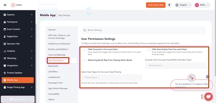 - Review and Save Settings: After configuring all necessary permissions and settings, review them to ensure they align with your event’s engagement strategy. Click the ‘Update Settings’ button to implement the changes.