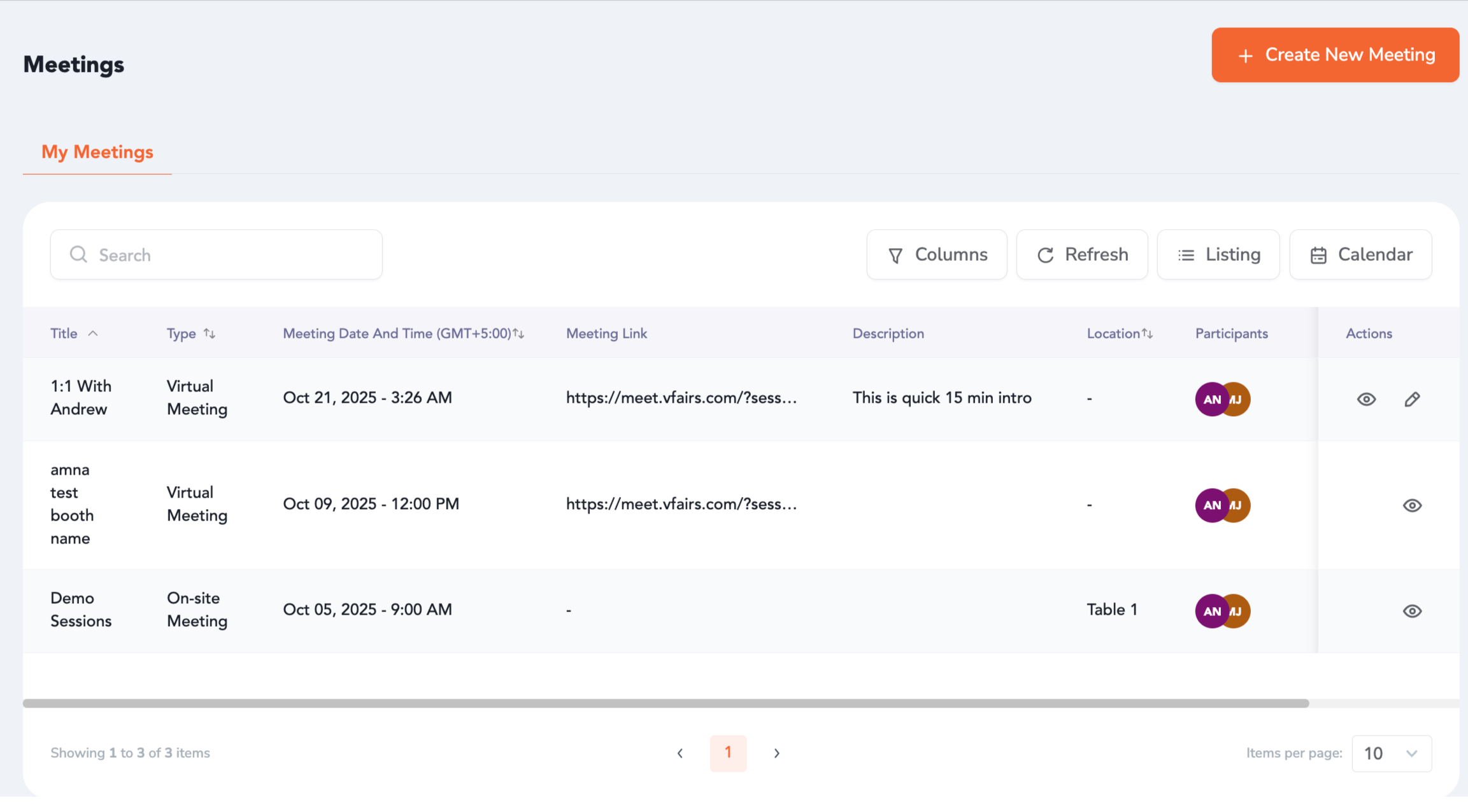 Exhibitors can now view, schedule, and manage their meetings directly from the Exhibitor Portal. This feature provides a centralized view of all meetings associated with the exhibitor’s booth, improving coordination and communication with attendees.