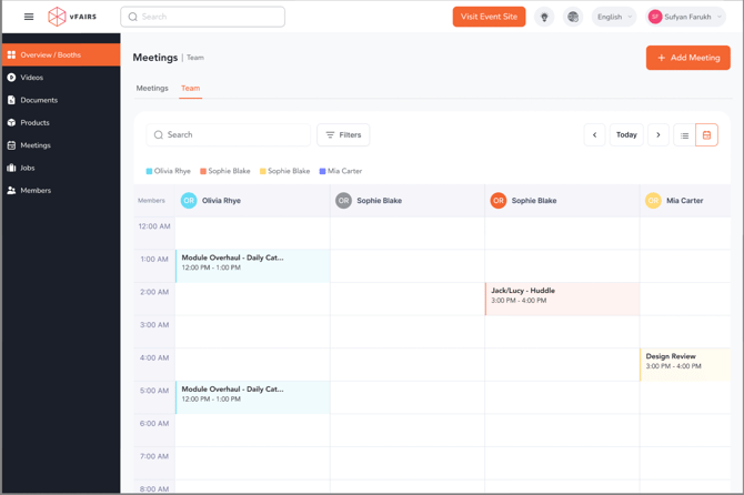 The Team Calendar in the Exhibitor Portal allows exhibitors to view all meetings scheduled for their booth team in one centralized place. This includes meetings booked for individual team members as well as meetings scheduled with attendees or other users