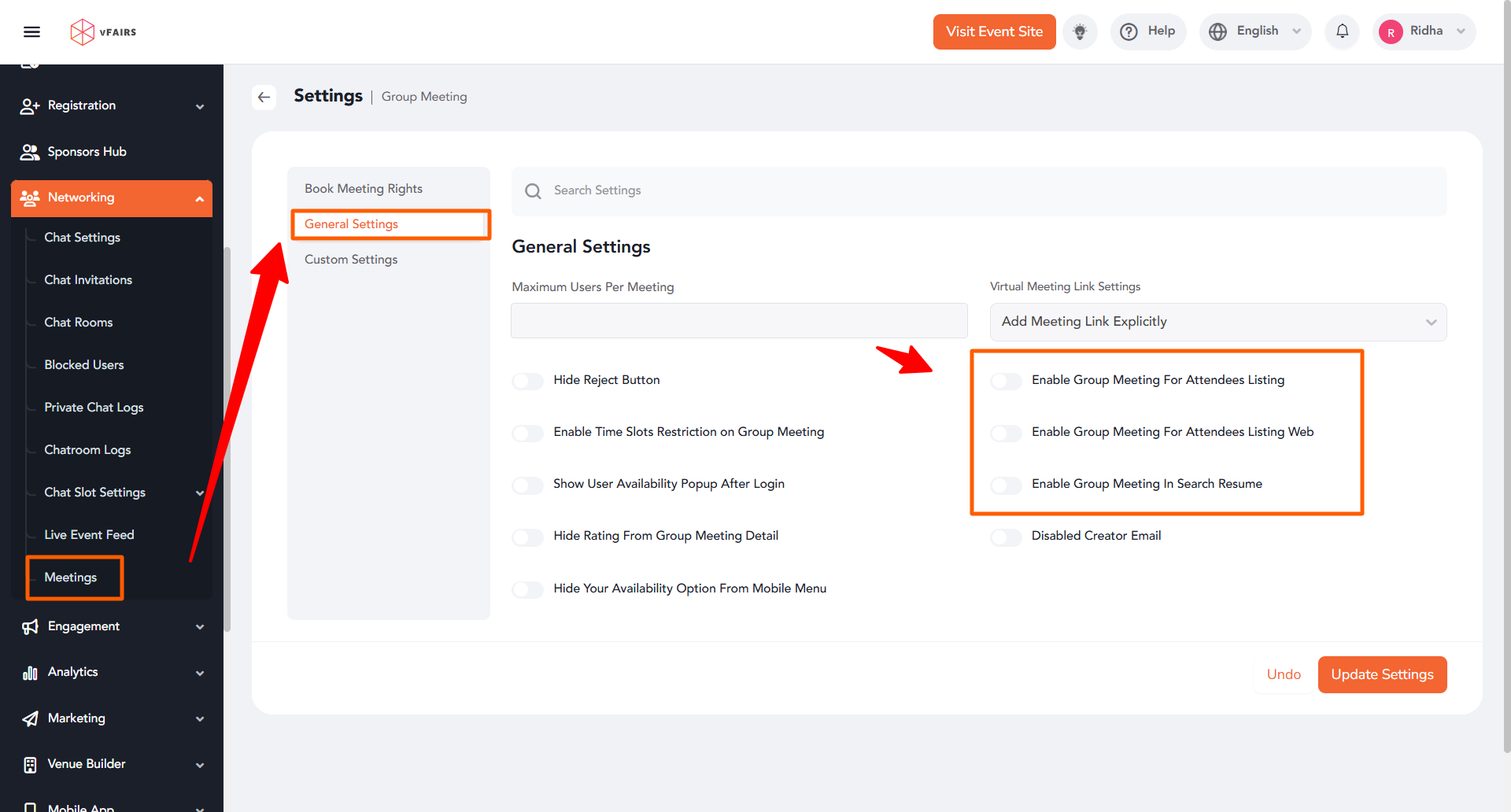 Ensure that meeting settings are enabled in the backend. Click Update. This ensures that meeting requests can be sent and managed properly.