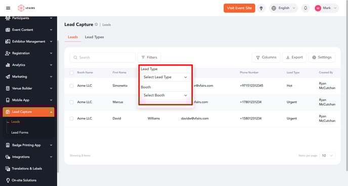 Example: I have selected Acme LLC booth in the Booths filter and can see the below leads of that booth.