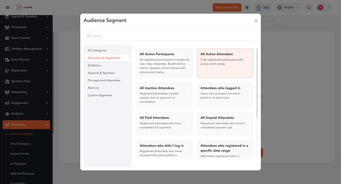 Learn how to target all registered participants in your event, including attendees, booth admins, admins, speakers, and event owners using the new “All Active Participants” audience segment.
