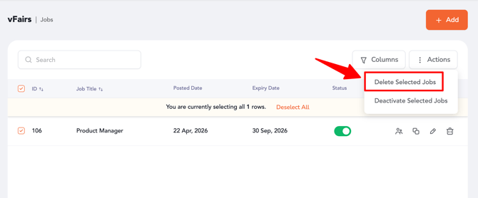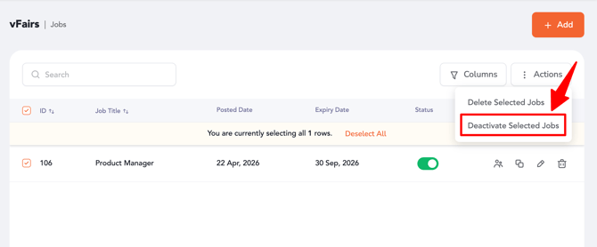 - Single Deactivate: Disable the status toggle in listing against job to deactivate it.