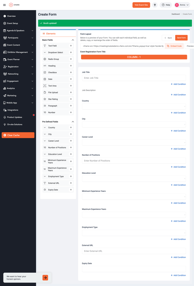 Organizers can now customize job posting fields using a Dynamic Job Creation Form. This allows you to tailor job listings based on your event requirements and collect relevant information from exhibitors when they post jobs.