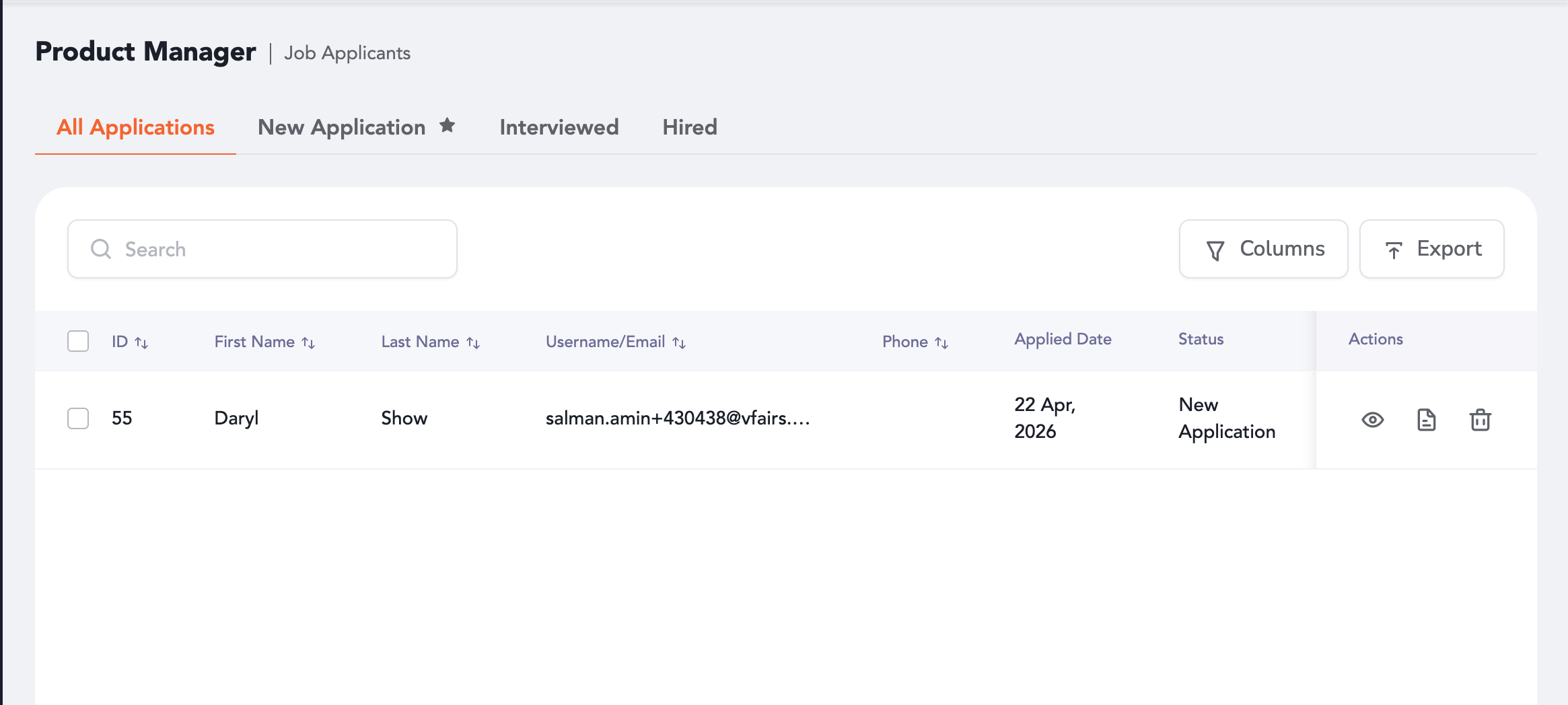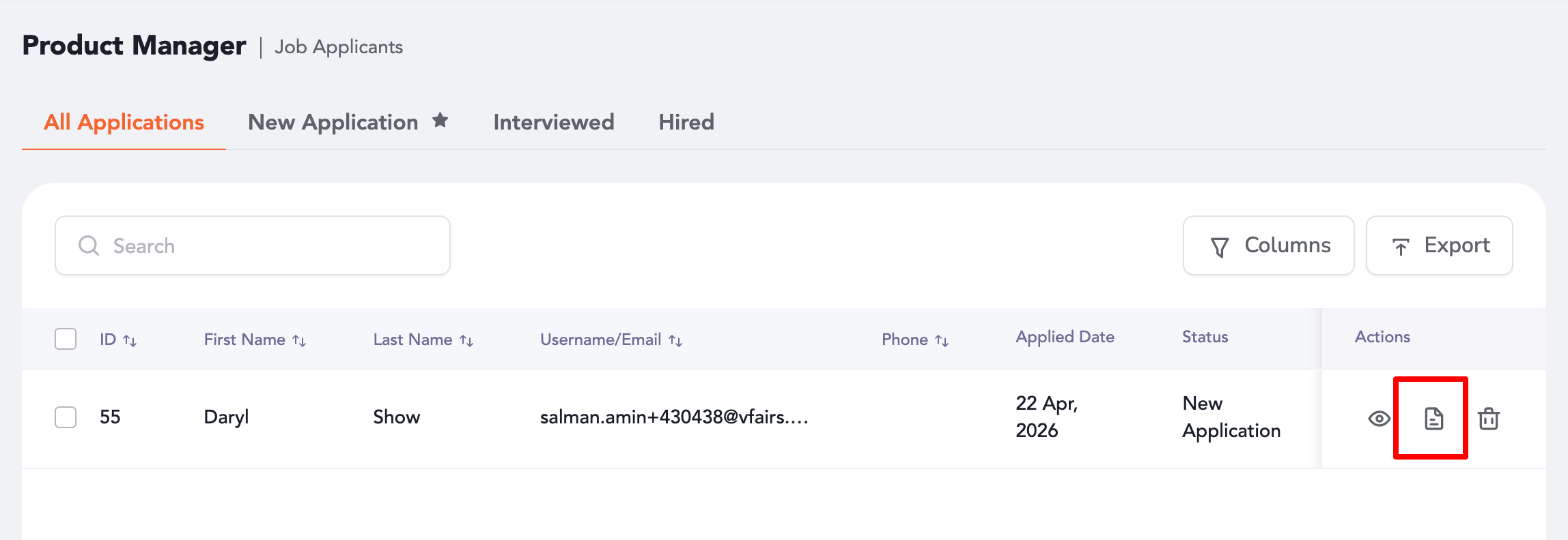 - Move candidates between stages based on their progress in the hiring process by clicking "update status" Icon.