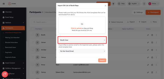 Go to Event Backend → Attendees & Registrants → Import Users.