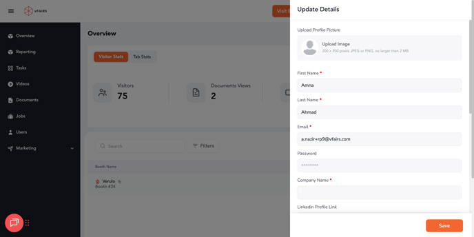 A drawer panel will open, displaying all exhibitor profile form fields.