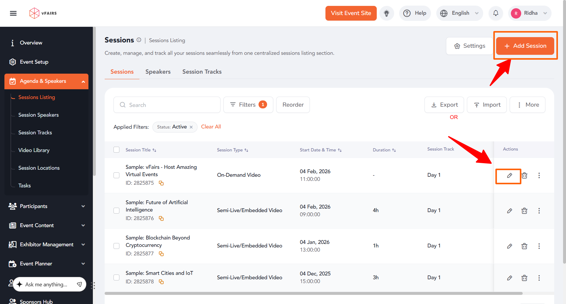 - Log in to your vFairs backend and go to the Agenda and Speakers section.