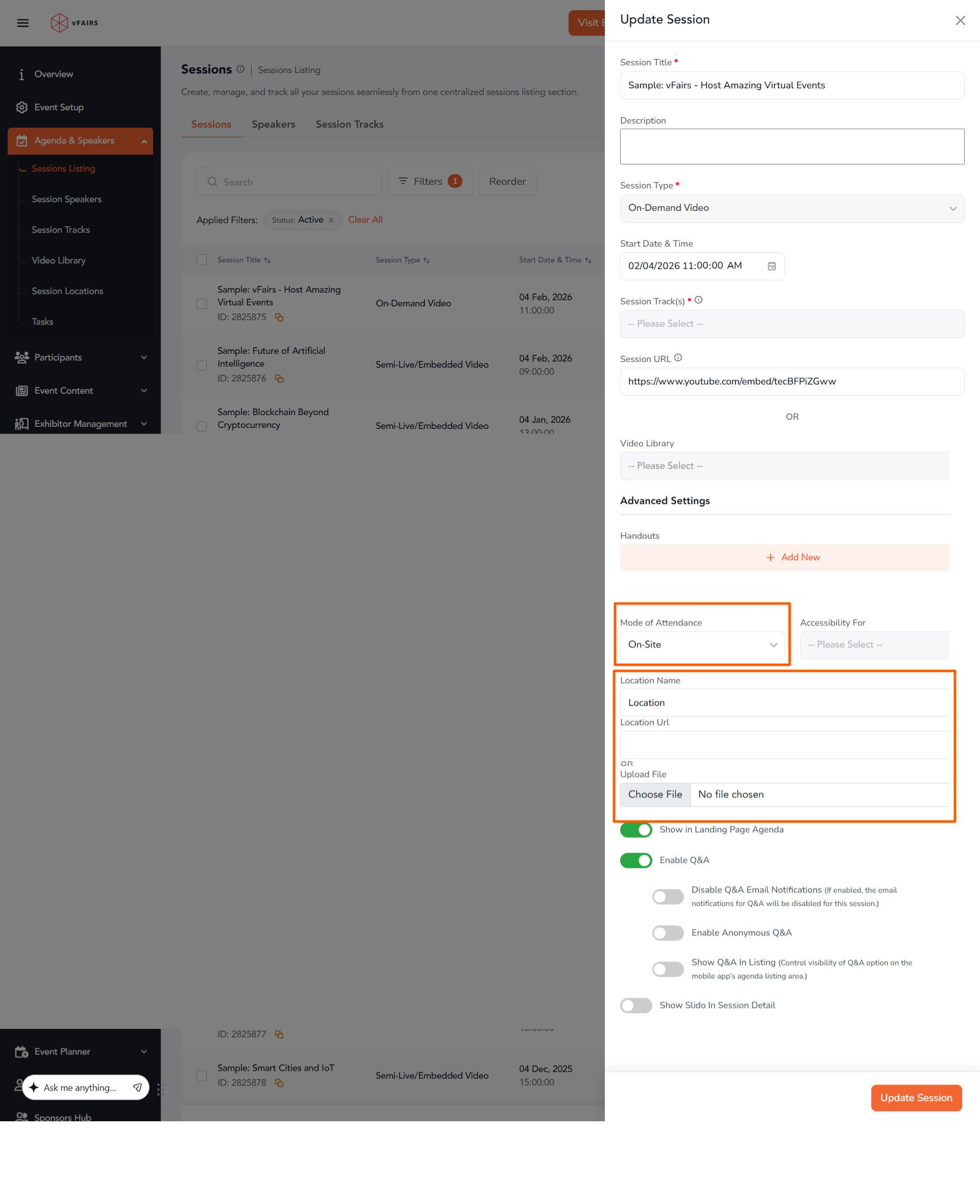 To add a location to a session in vFairs, follow the simple steps below. You can either add a new session or edit an existing one to include location details, such as in-person session information.