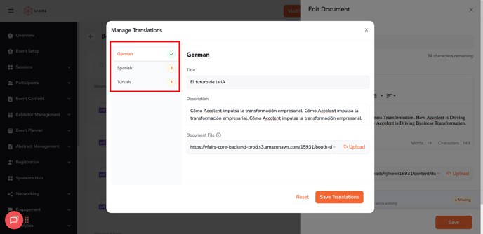 If your event is multilingual, you can provide translated titles and descriptions for booth videos and documents. This ensures that attendees see content in their preferred language, creating a more inclusive event experience.