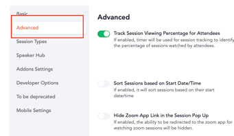 Navigate to the backend of your event platform and open the Sessions Listing area. From there, go to the Advance Settings section.