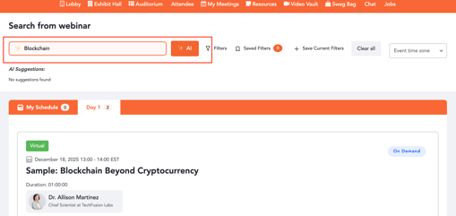 Once enabled, head to the Agenda Listing area within the web event’s internal environment to see the AI-powered search in action.
