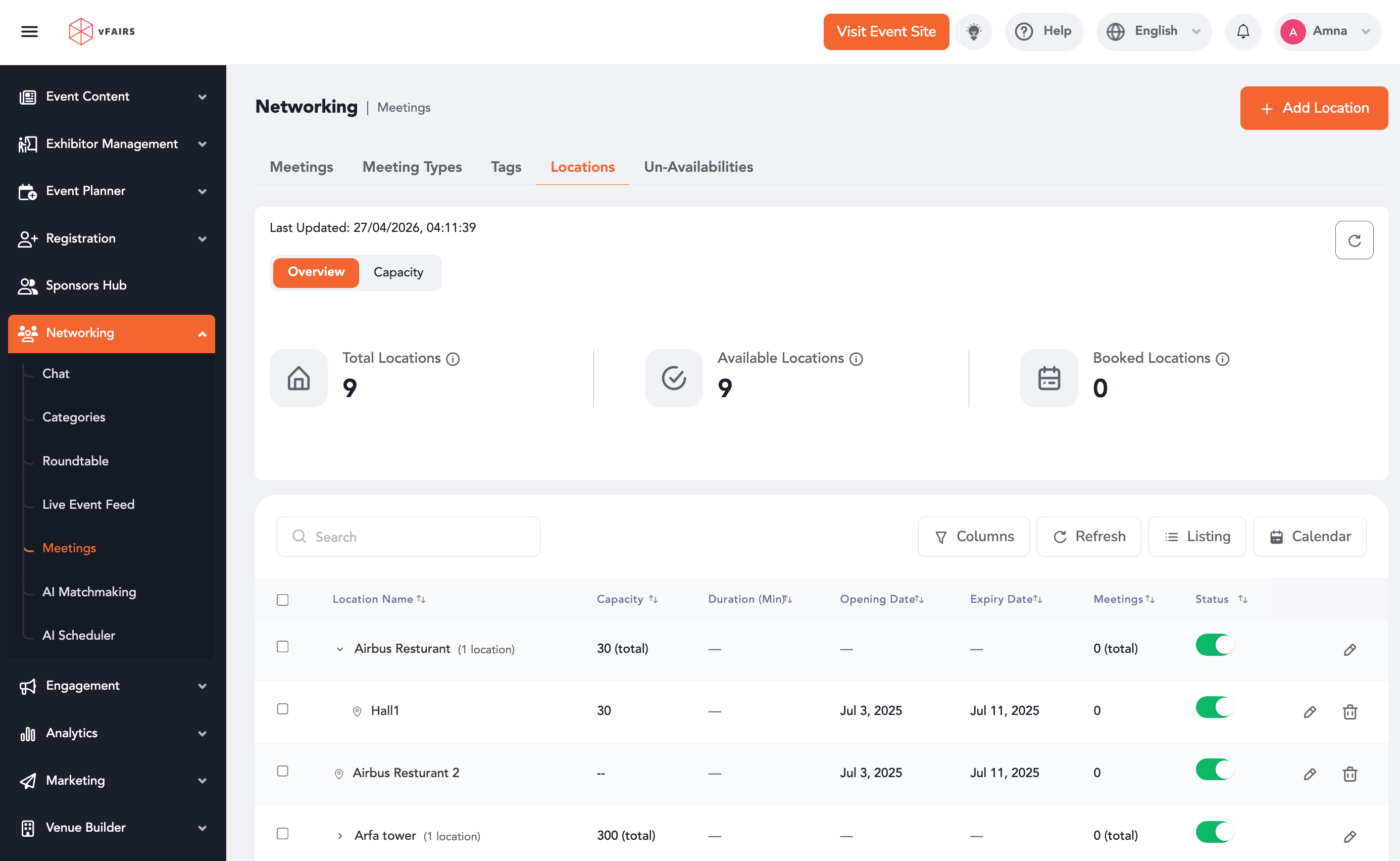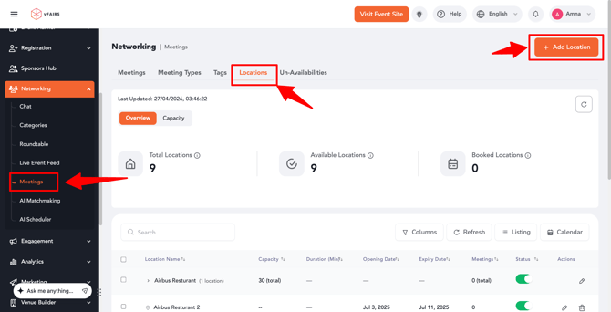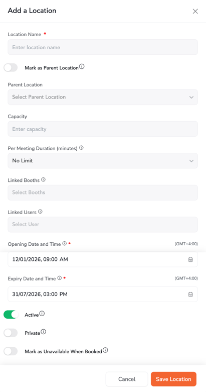 For physical and hybrid events, setting up meeting locations is essential to ensure meetings are scheduled in the correct rooms or areas. The Meeting Module allows organizers to define different types of locations, manage capacity, and associate locations with booths and users for a seamless booking experience.