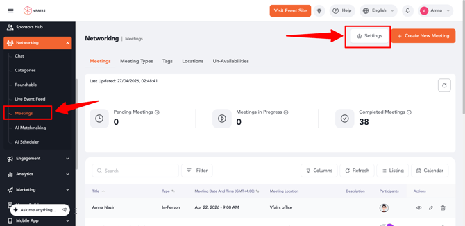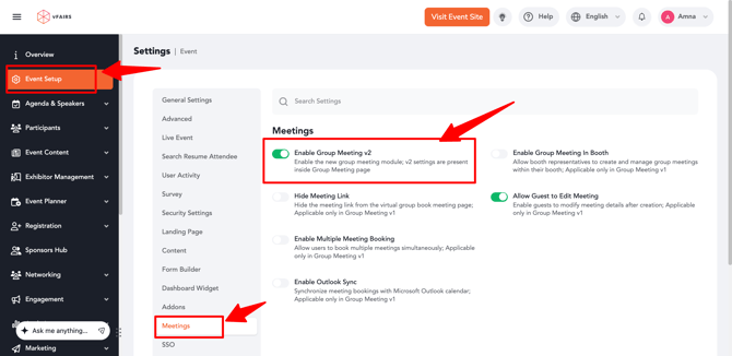 - Navigate to Event Settings → Meetings.