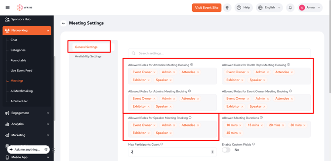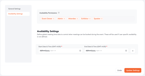 - Define the time window (within event timings) during which meetings can be booked.