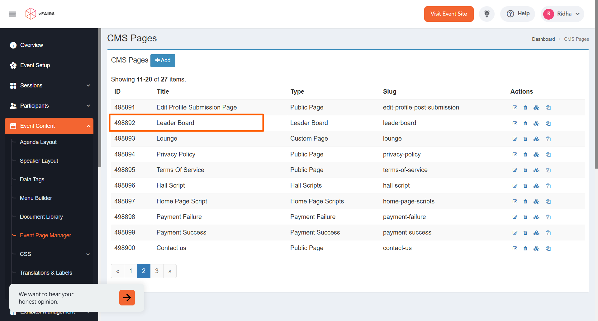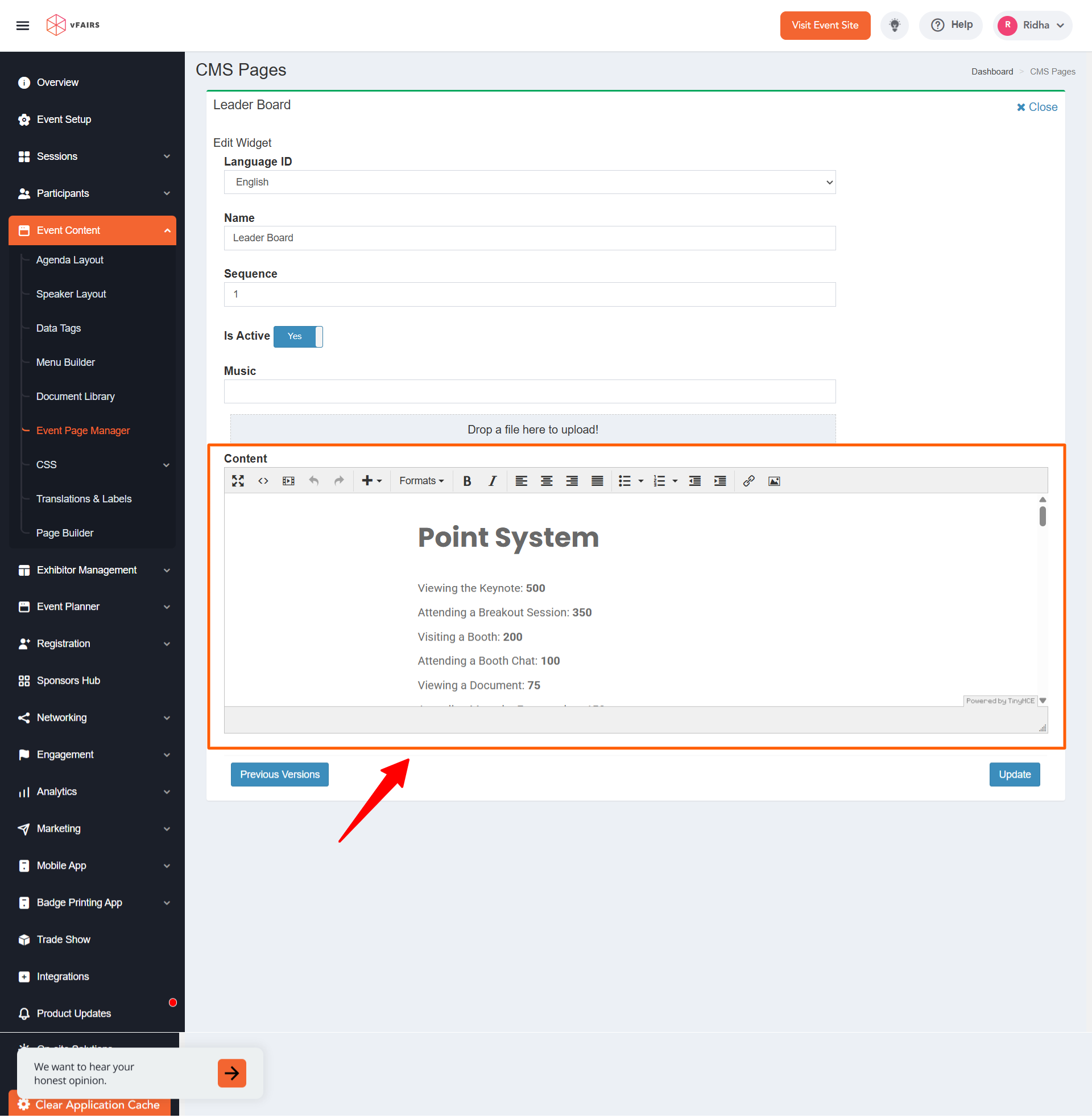 - Log in to your vFairs backend and navigate to the Event Content section.