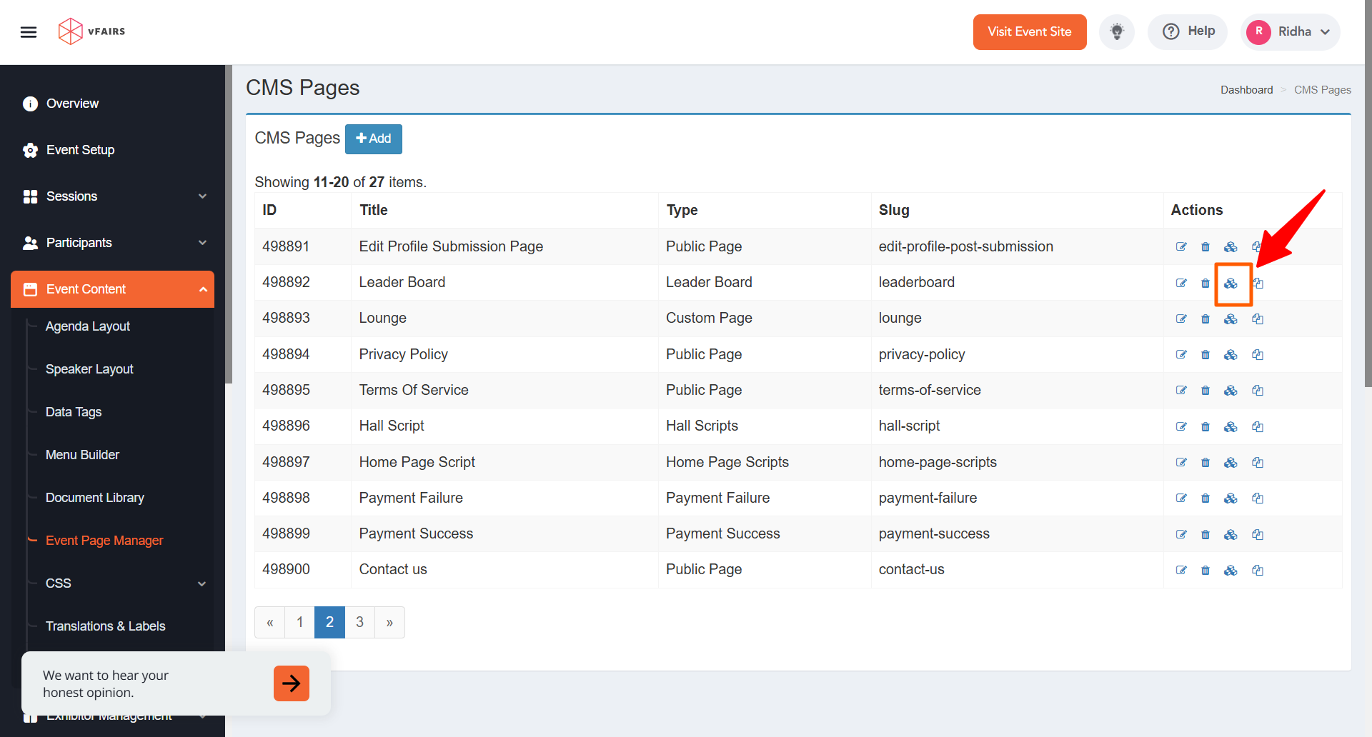 - Access the Event Page Manager