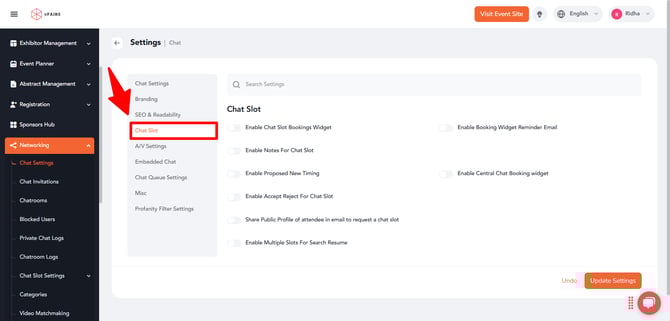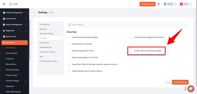 Conclusion: Enabling the Central Chat Booking Widget in vFairs is straightforward but vital for enhancing the networking experience at your event. By following these steps, you can ensure that your participants have a smooth and organized way to schedule and participate in chats, boosting interaction and engagement opportunities throughout the event.