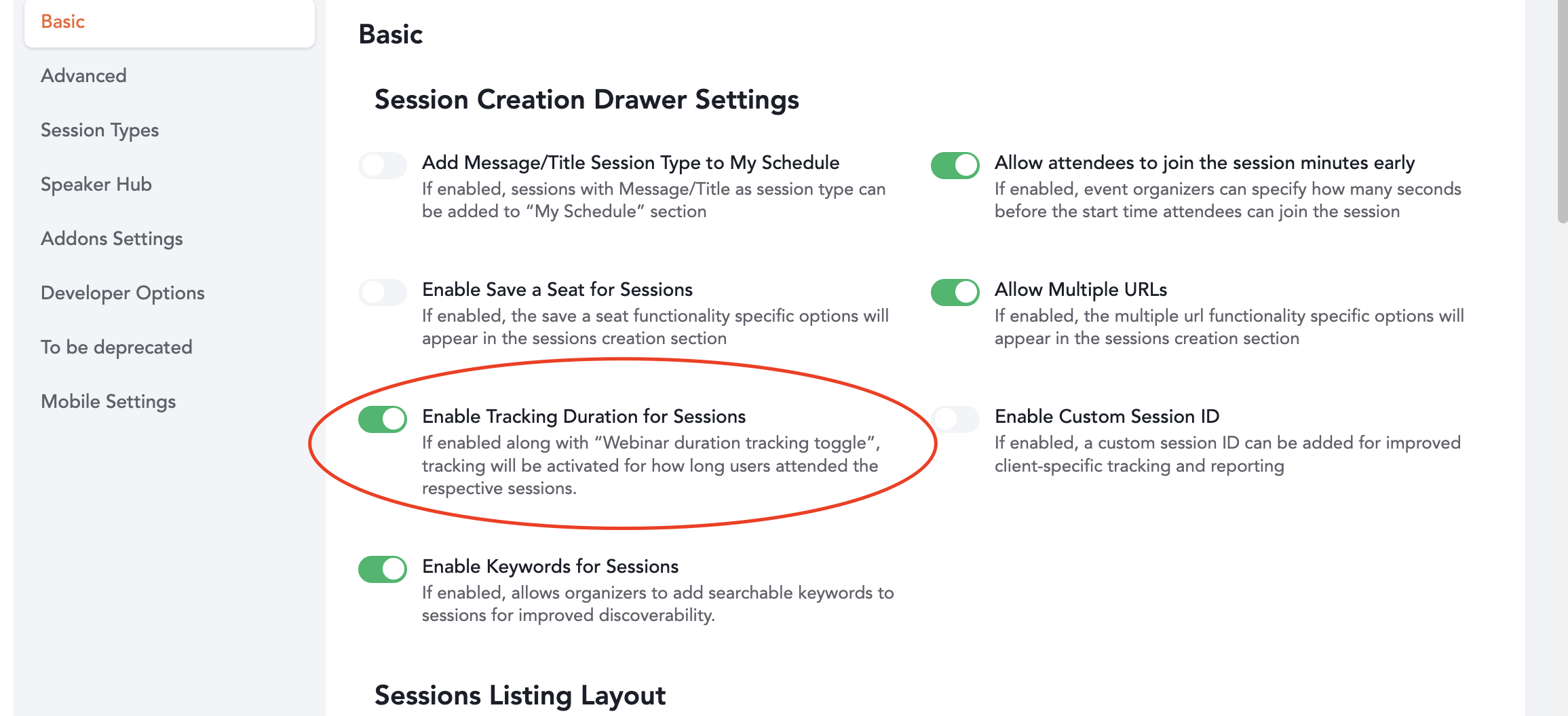 2. Under the Basic Settings section, enable the toggle labeled “Enable Tracking Duration for Sessions.”