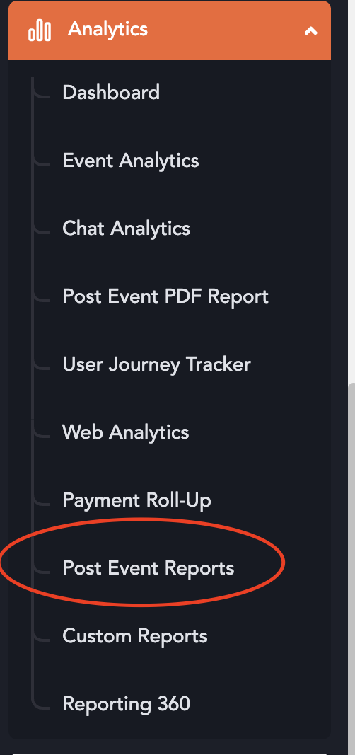 From the backend, go to the Analytics section and open Post Event Reports.