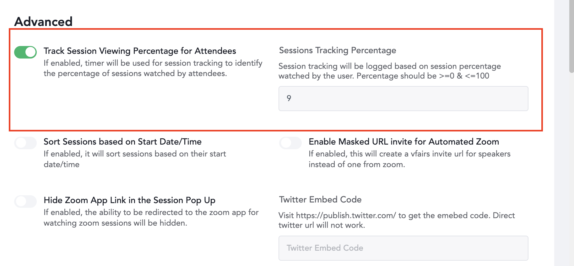 3. Next, go to the Advanced Settings section and enable “Track Session Viewing Percentage for Attendees.”