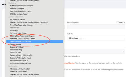 2. In the Report Type dropdown, select “Session Duration Tracking.”