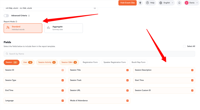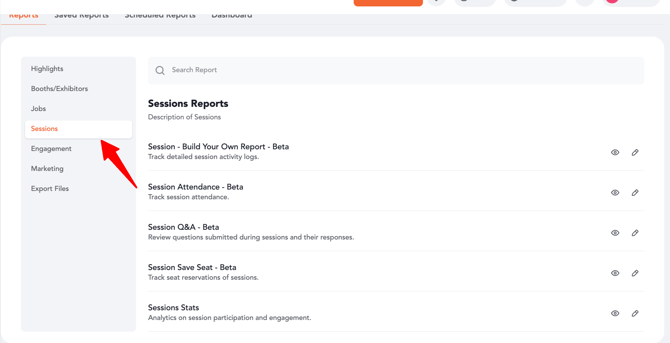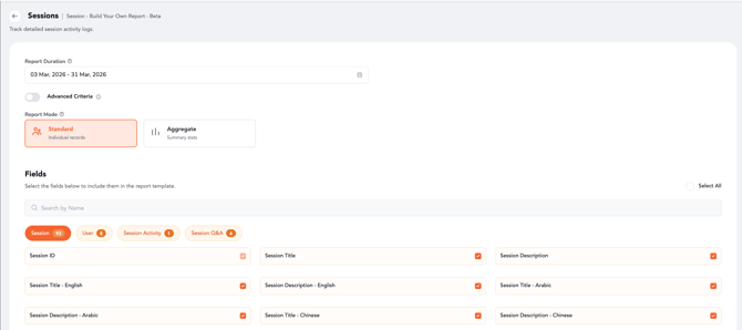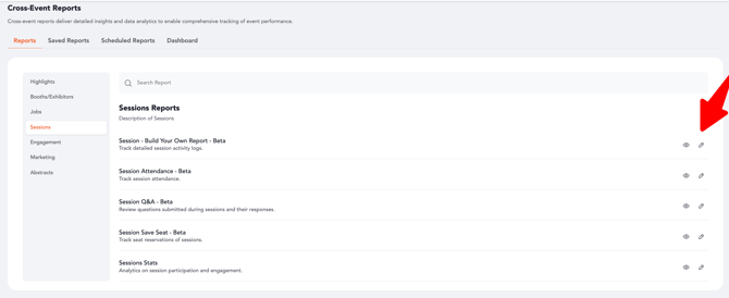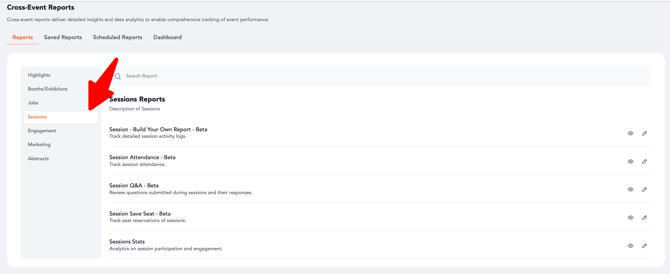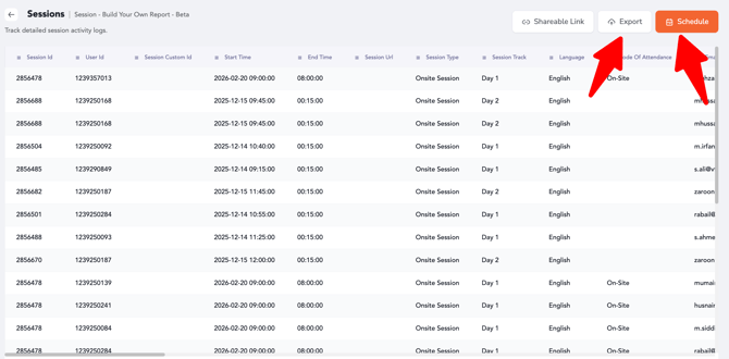 Using the Reporting module, you can easily extract, export, or schedule these reports for both individual events and cross-event analysis. This guide outlines the steps to generate session reports and highlights how the same process applies across multiple session-related report types.