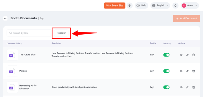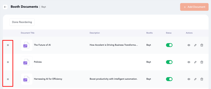 This guide explains how event admins or booth owners can change the display order of booth documents. Reordering ensures that key documents—such as brochures, PDFs, or presentations—are highlighted first on the event’s frontend.