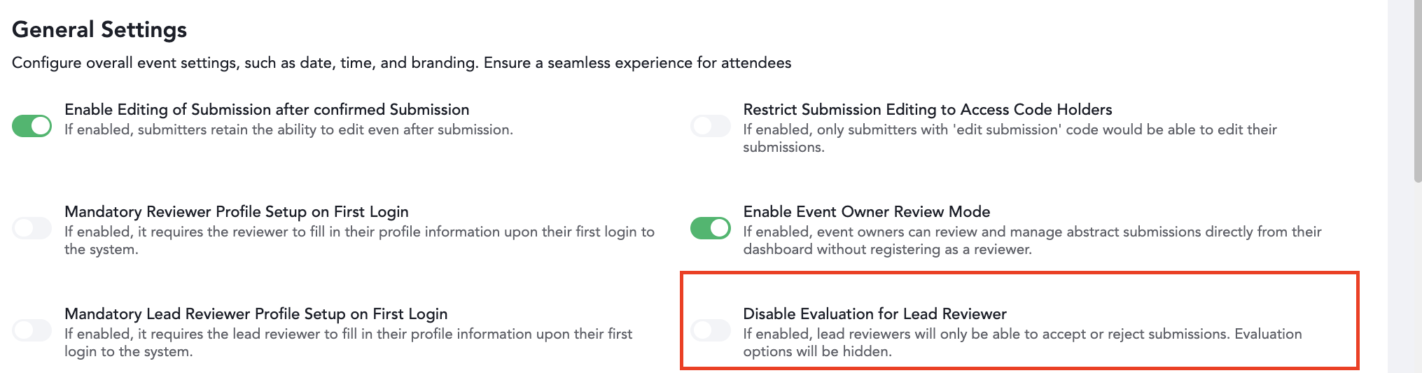 Learn how to disable evaluation permissions for lead reviewers so they can provide final decisions on submissions without performing individual evaluations.