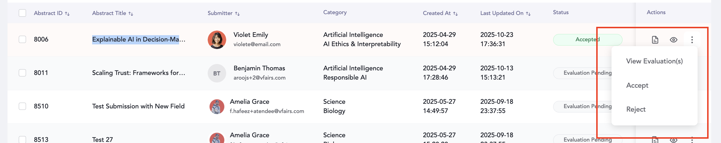4. As soon as the lead reviewer logs in to the reviewer portal and access the assigned submissions, they'll only see the options to "Accept/Reject" the submission and the one to "Evaluate" will be hidden.