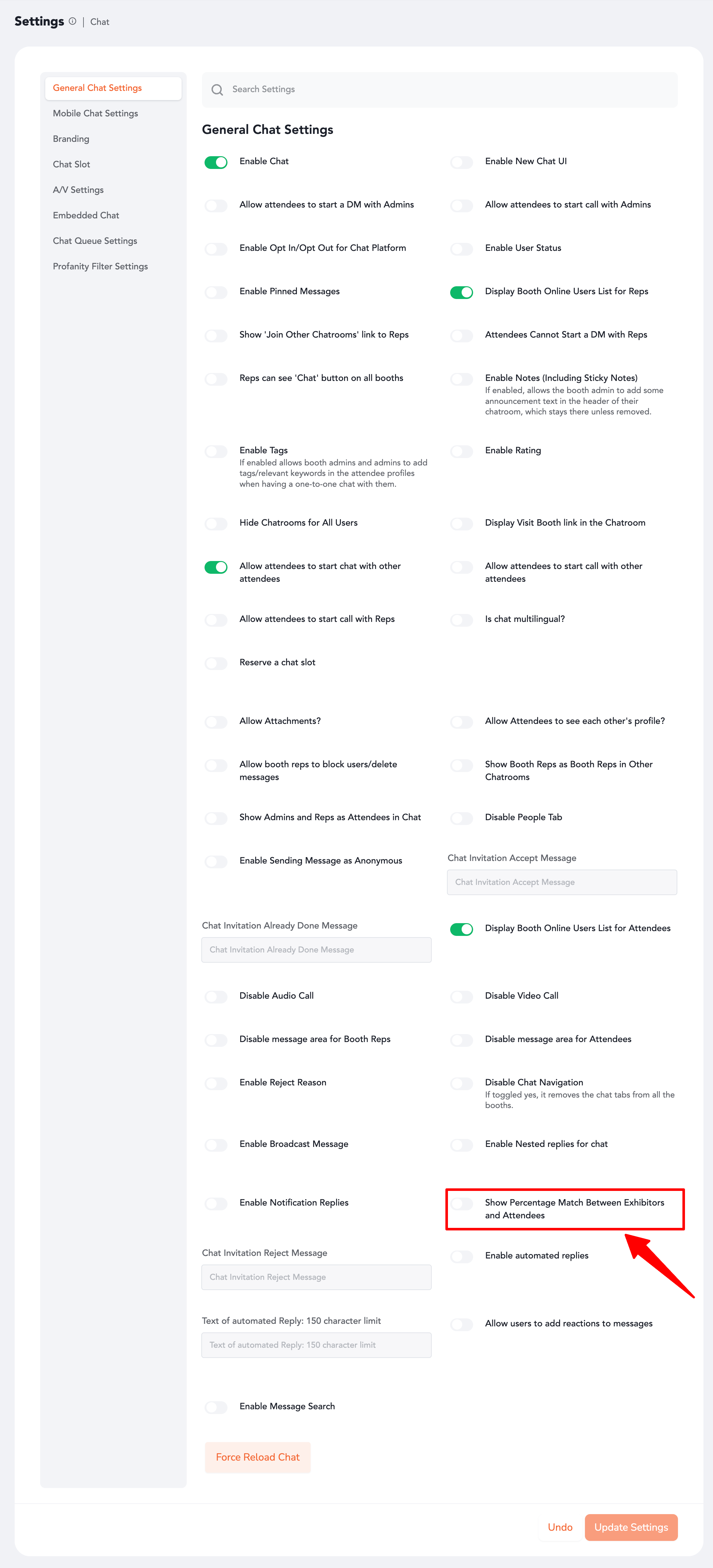 In the Chat Settings screen, look for the toggle titled ‘Show Percentage Match Between Exhibitors and Attendees’ at the bottom of the page. This toggle allows you to enable the feature that displays the compatibility score between exhibitors and attendees.