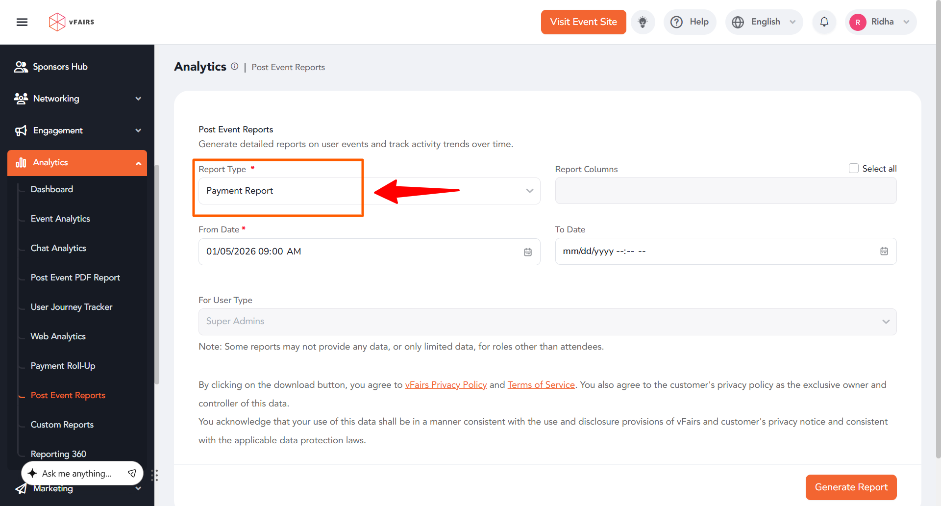 - From the dropdown menu, you will find the Payment Report option. Select it to access the report.