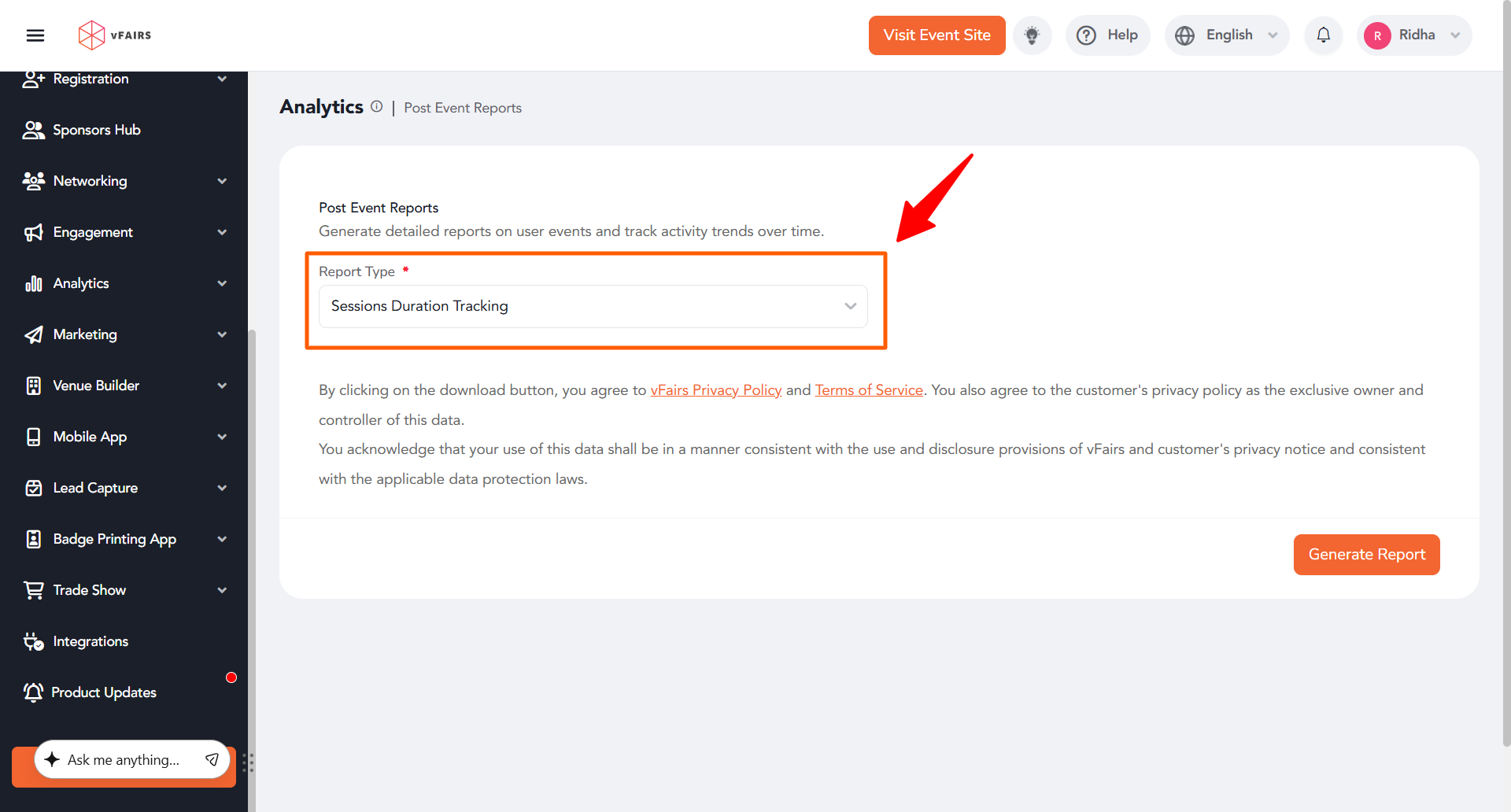 vFairs tracks attendee engagement with videos, including duration and any fast-forwarding actions. Access this data via the Sessions Duration Tracking Report to analyze attendee behavior and make data-driven improvements.